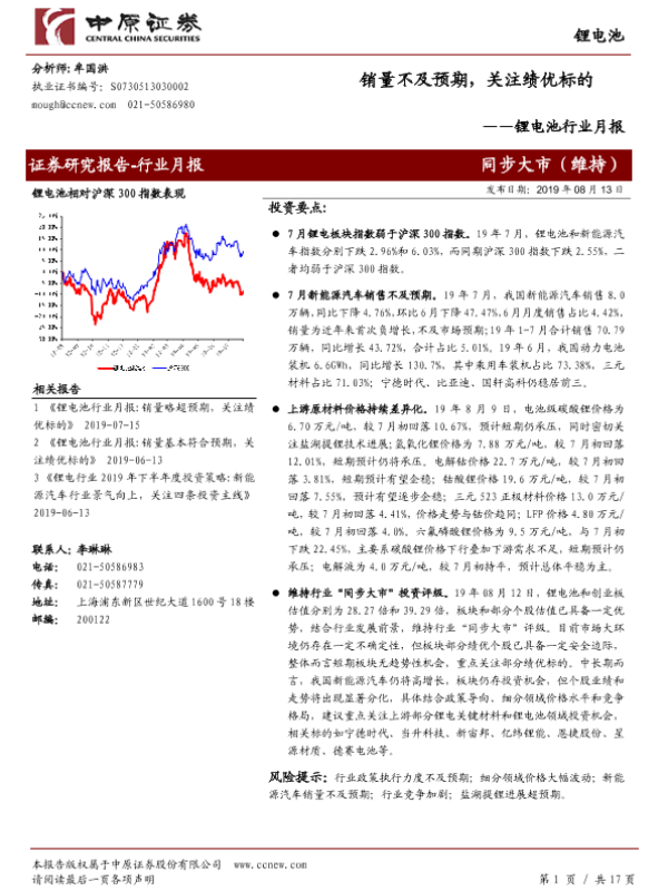 【中原证券】【20190813】锂电池行业月报:销量不及预期,关注绩优标的-17页