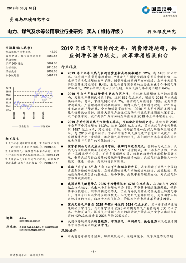 【国金证券】【20190816】2019天然气市场转折之年:消费增速趋稳,供应侧增长潜力较大,改革举措密集出台-22页
