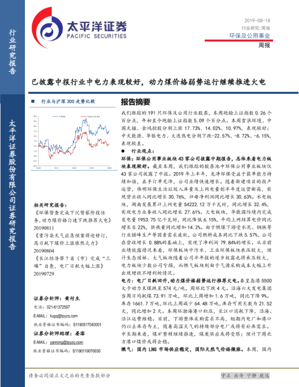 【太平洋证券】【20190818】环保及公用事业周报:已披露中报行业中电力表现较好,动力煤价格弱势运行继续推进火电-17页