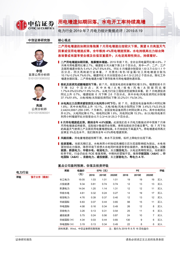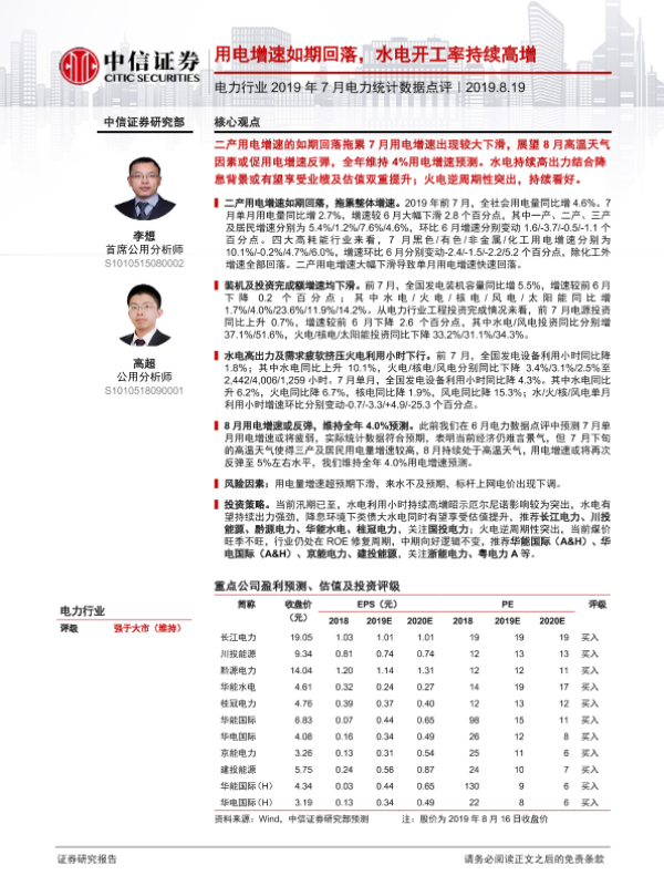 【中信证券】【20190819】2019年7月份电力统计数据点评:用电增速如期回落,水电开工率持续高增-14页
