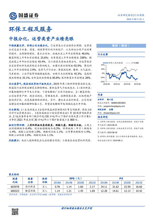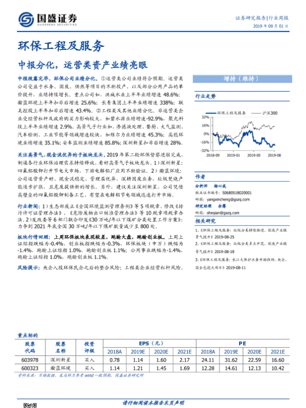 【国盛证券】【20190901】环保工程及服务行业周报:中报分化,运营类资产业绩亮眼-20页
