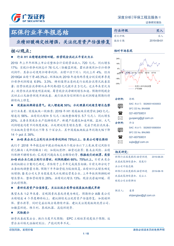 【广发证券】【20190901】环保行业半年报总结:业绩回暖确定性增强,关注优质资产估值修复-15页