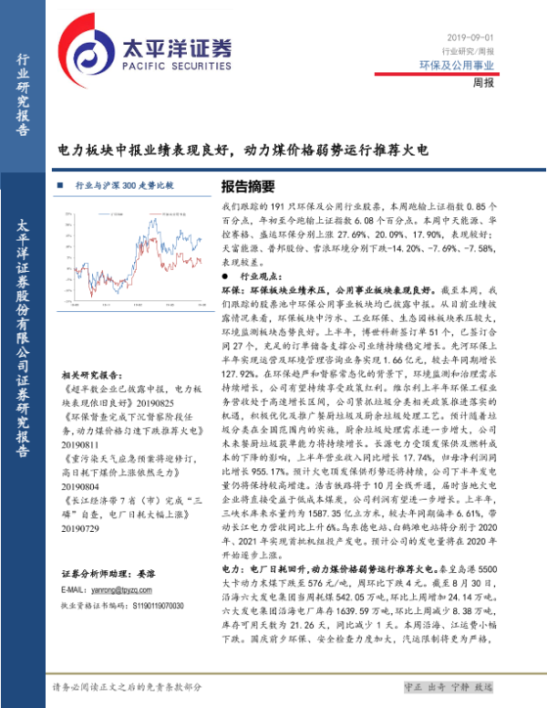 【太平洋证券】【20190901】环保及公用事业周报:电力板块中报业绩表现良好,动力煤价格弱势运行推荐火电-17页