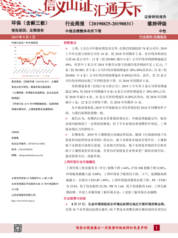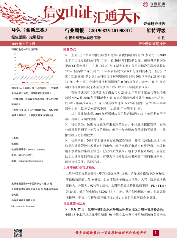 【山西证券】【20190901】环保(含新三板)行业周报:中报业绩整体有所下滑-14页