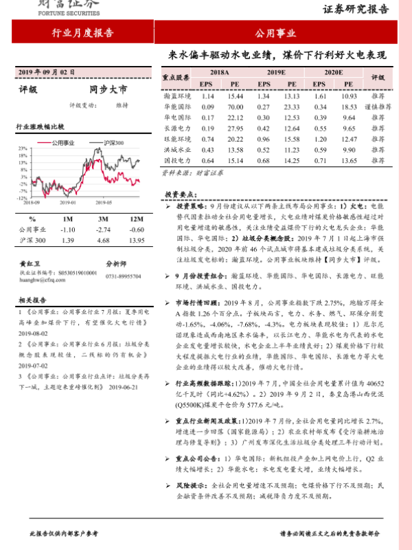 【财信证券】【20190902】公用事业行业月度报告:来水偏丰驱动水电业绩,煤价下行利好火电表现-15页