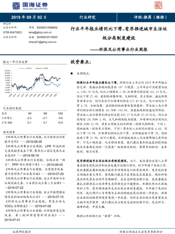 【国海证券】【20190902】环保及公用事业行业周报:行业半年报业绩同比下滑,有序推进城市生活垃圾分类制度建设-12页