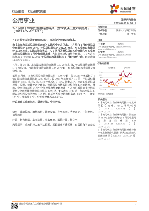 【天风证券】【20190908】7-8月份干垃圾处置量明显减少,湿垃圾分出量大幅提高-9页