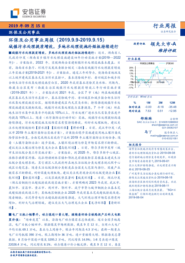 【安信证券】【20190915】环保及公用事业周报:城镇污水处理提质增效,多地水处理设施补短板持续进行-19页