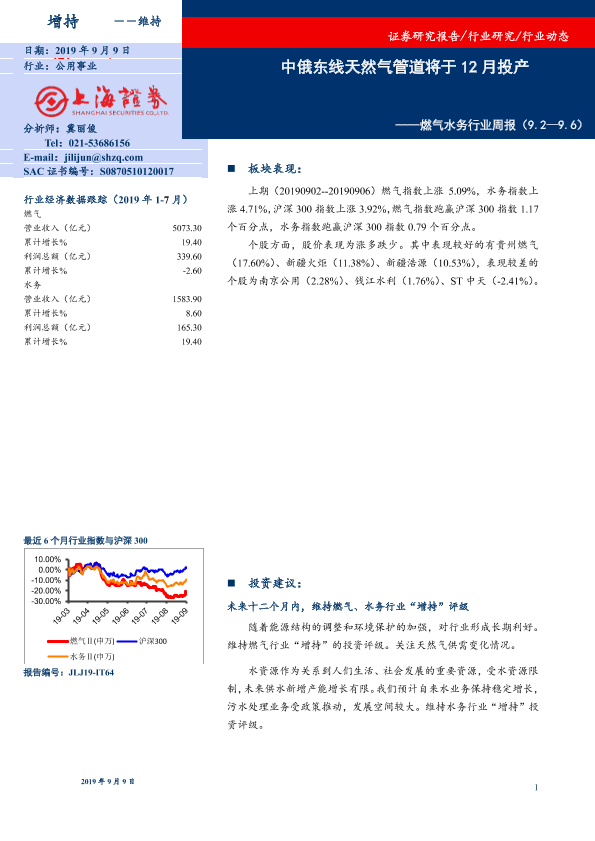 【上海证券】【20190909】燃气水务行业周报:中俄东线天然气管道将于12月投产-9页