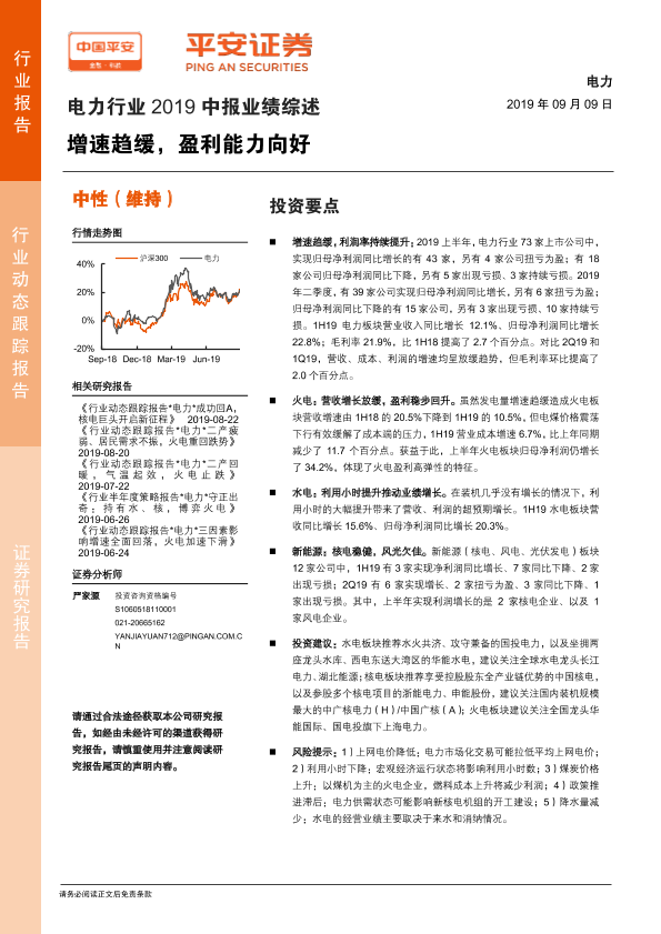 【平安证券】【20190909】电力行业2019中报业绩综述:增速趋缓,盈利能力向好-14页