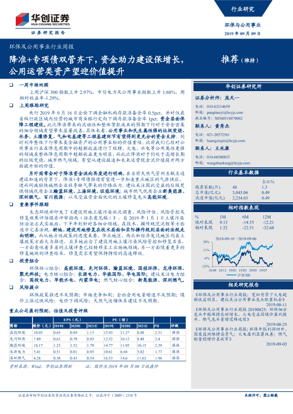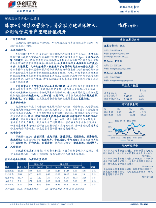 【华创证券】【20190909】环保及公用事业行业周报:降准+专项债双管齐下,资金助力建设保增长,公用运营类资产望迎价值提升-28页