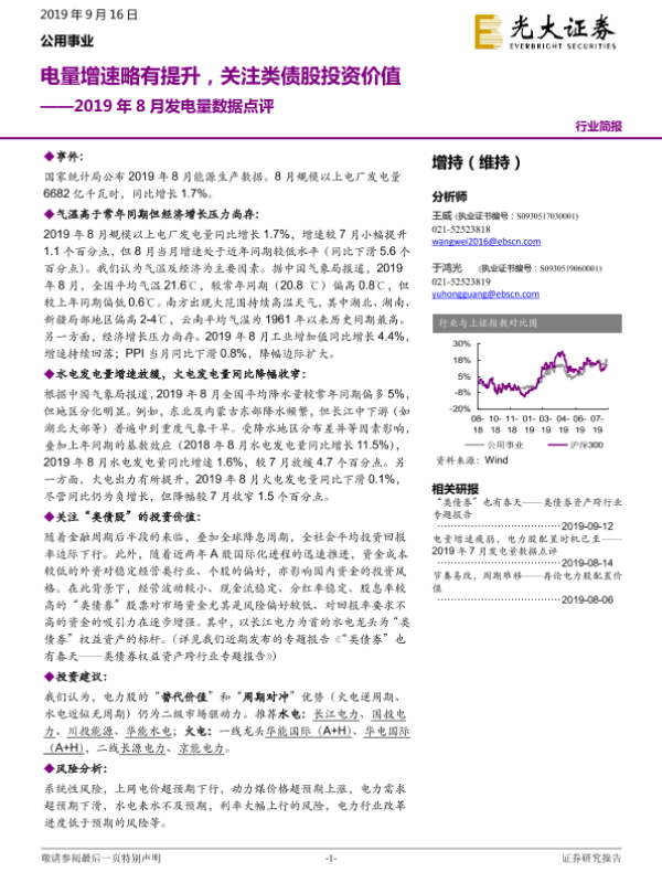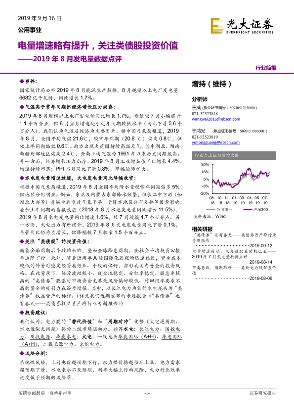 【光大证券】【20190916】2019年8月发电量数据点评:电量增速略有提升,关注类债股投资价值-4页