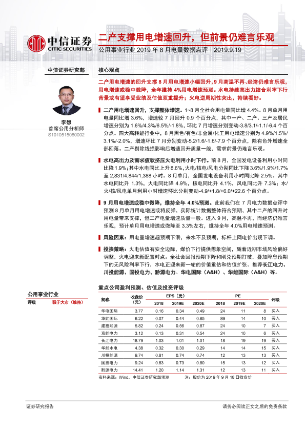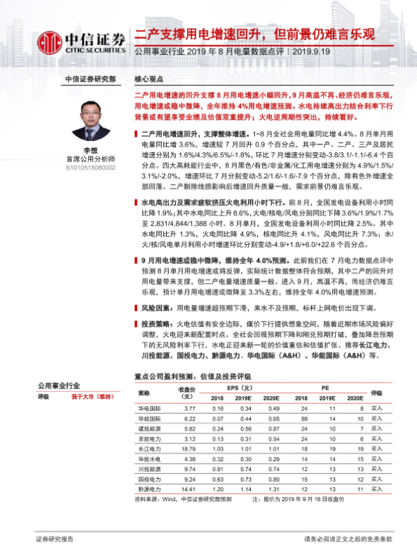 【中信证券】【20190919】2019年8月电量数据点评:二产支撑用电增速回升,但前景仍难言乐观-14页
