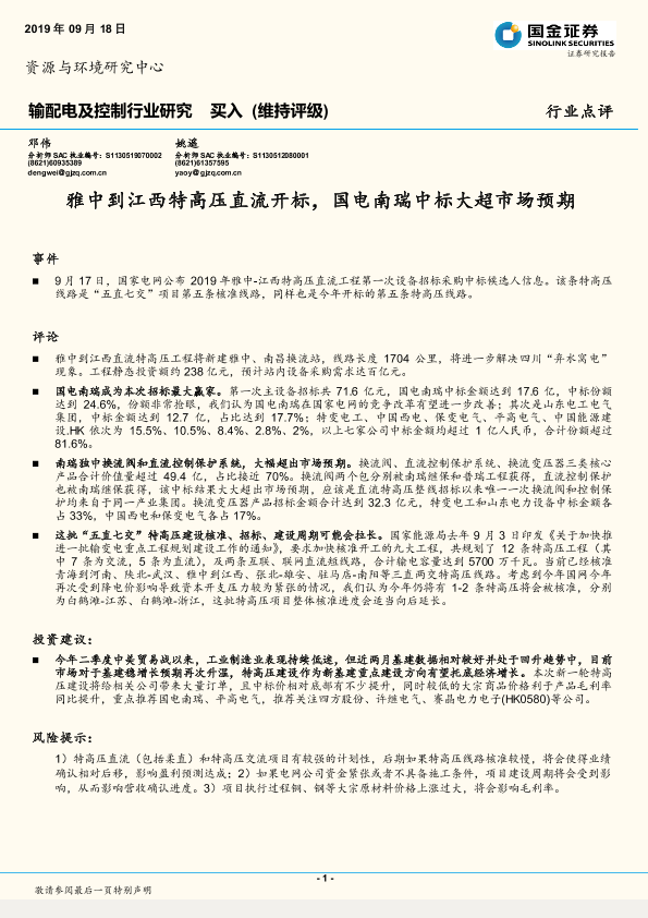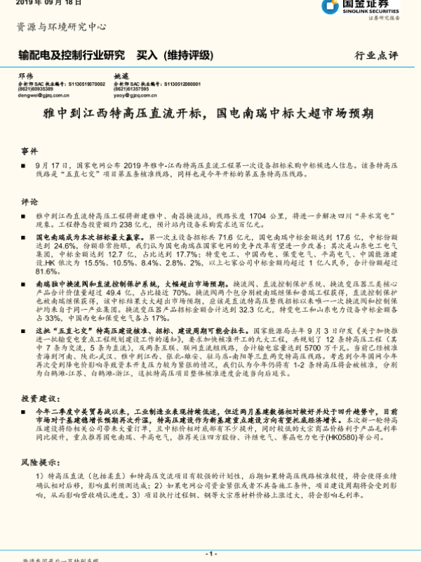 【国金证券】【20190918】输配电及控制行业研究:雅中到江西特高压直流开标,国电南瑞中标大超市场预期-5页