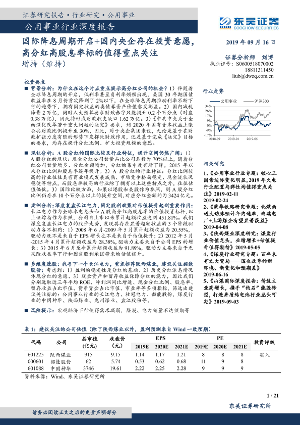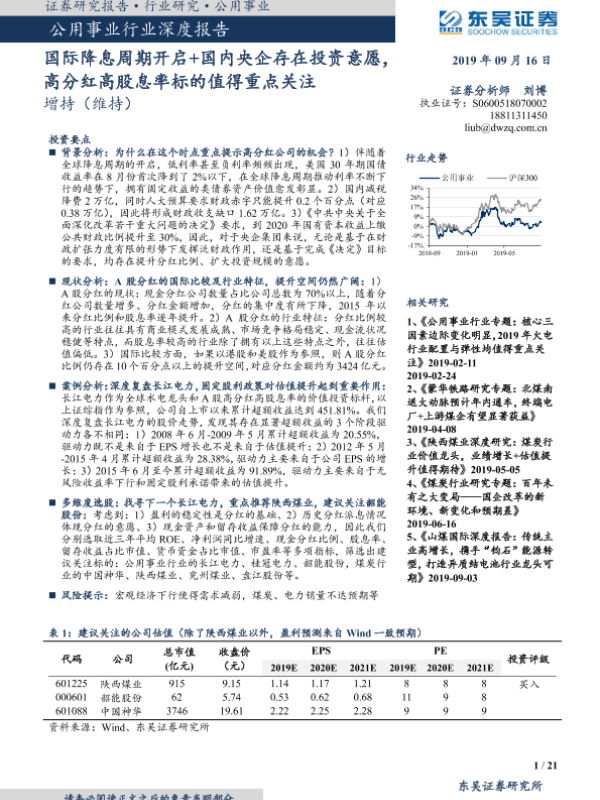 【东吴证券】【20190916】公用事业行业深度报告:国际降息周期开启+国内央企存在投资意愿,高分红高股息率标的值得重点关注-21页