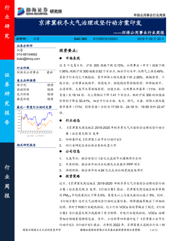 【渤海证券】【20190920】环保公用事业行业周报:京津冀秋冬大气治理攻坚行动方案印发-12页