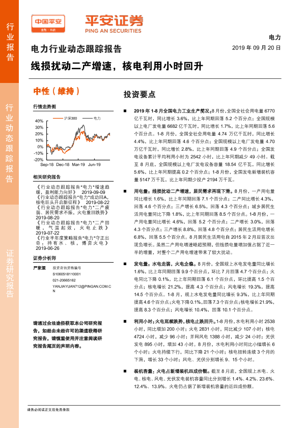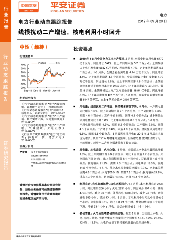 【平安证券】【20190920】电力行业动态跟踪报告:线损扰动二产增速,核电利用小时回升-15页