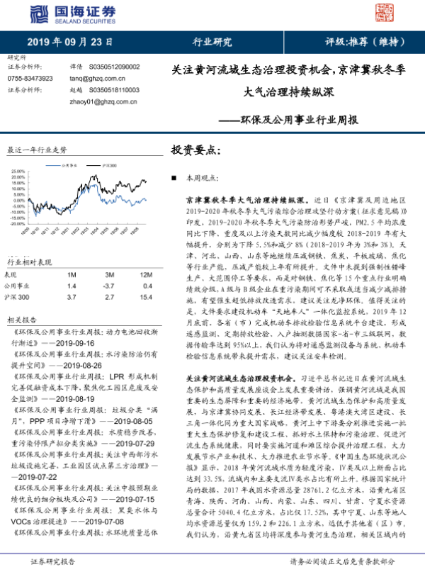【国海证券】【20190923】环保及公用事业行业周报:关注黄河流域生态治理投资机会,京津冀秋冬季大气治理持续纵深-11页
