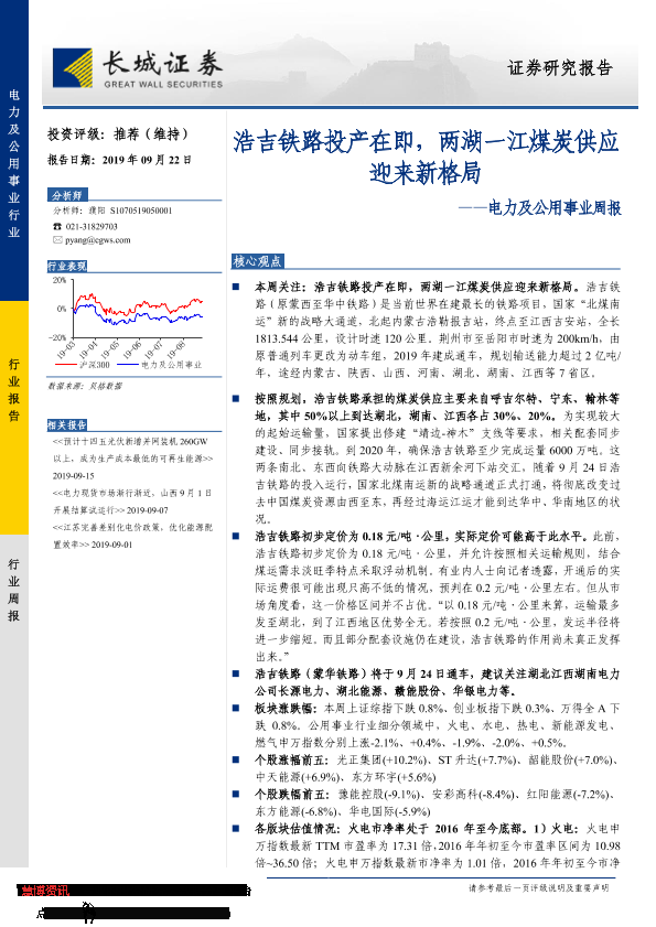 【长城证券】【20190922】电力及公用事业周报:浩吉铁路投产在即,两湖一江煤炭供应迎来新格局-13页