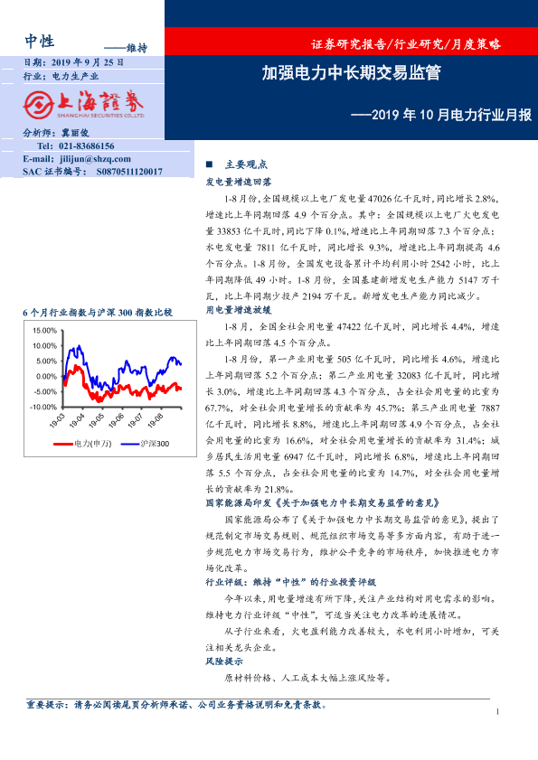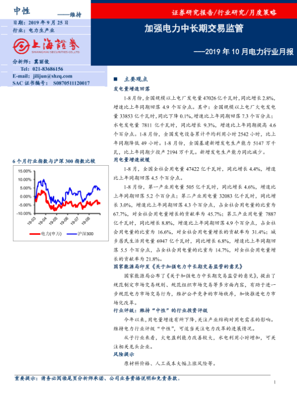 【上海证券】【20190925】2019年10月电力行业月报:加强电力中长期交易监管-11页