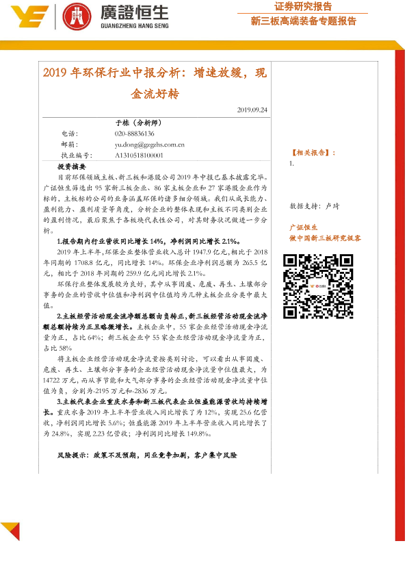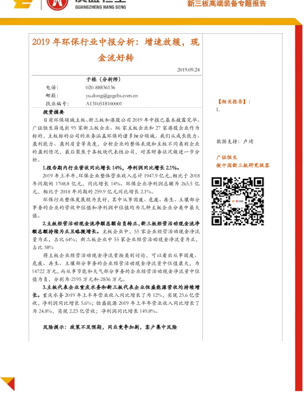 【广证恒生】【20190924】2019年环保行业中报分析:增速放缓,现金流好转-17页