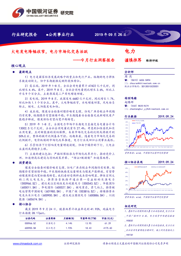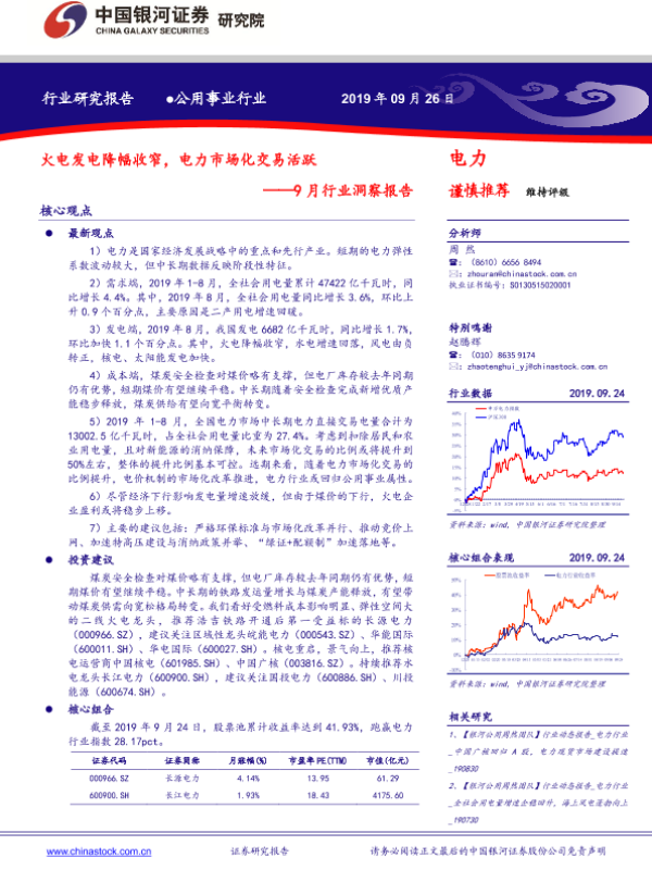 【银河证券】【20190926】电力9月行业洞察报告:火电发电降幅收窄,电力市场化交易活跃-24页