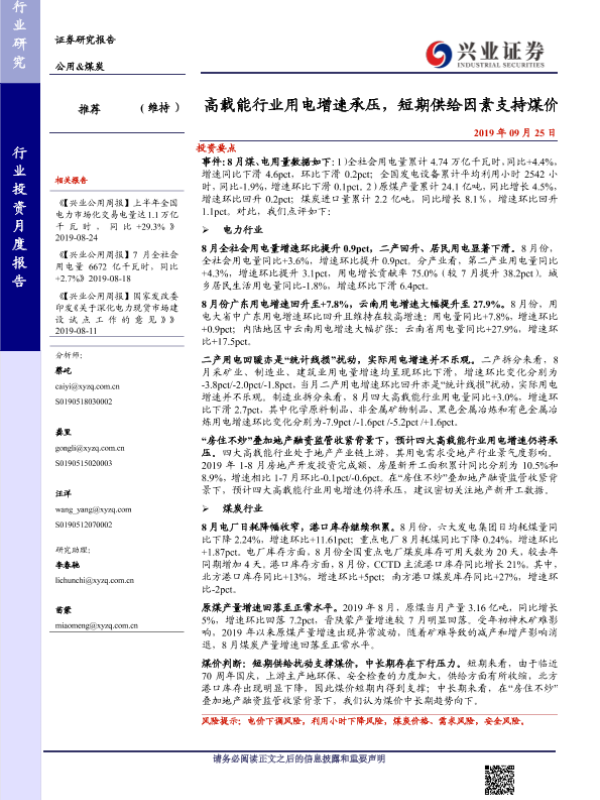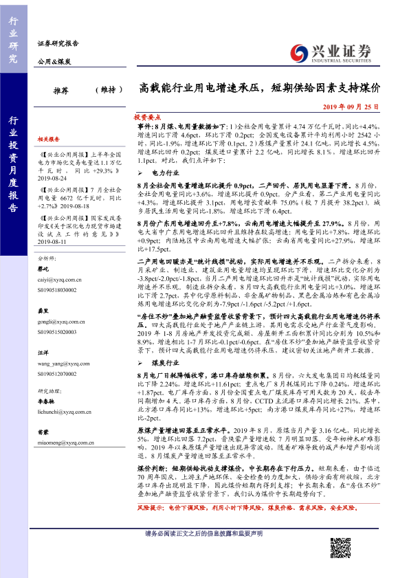 【兴业证券】【20190925】高载能行业用电增速承压,短期供给因素支持煤价-22页
