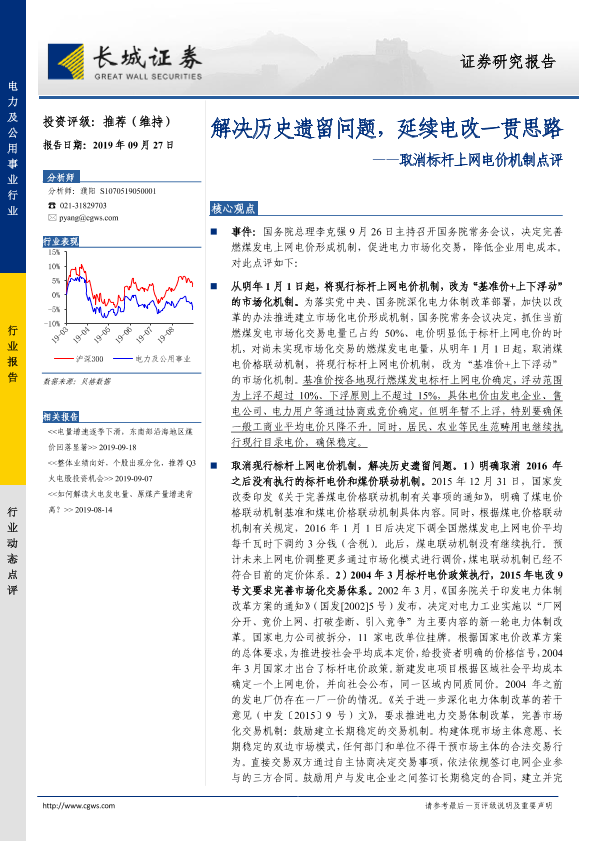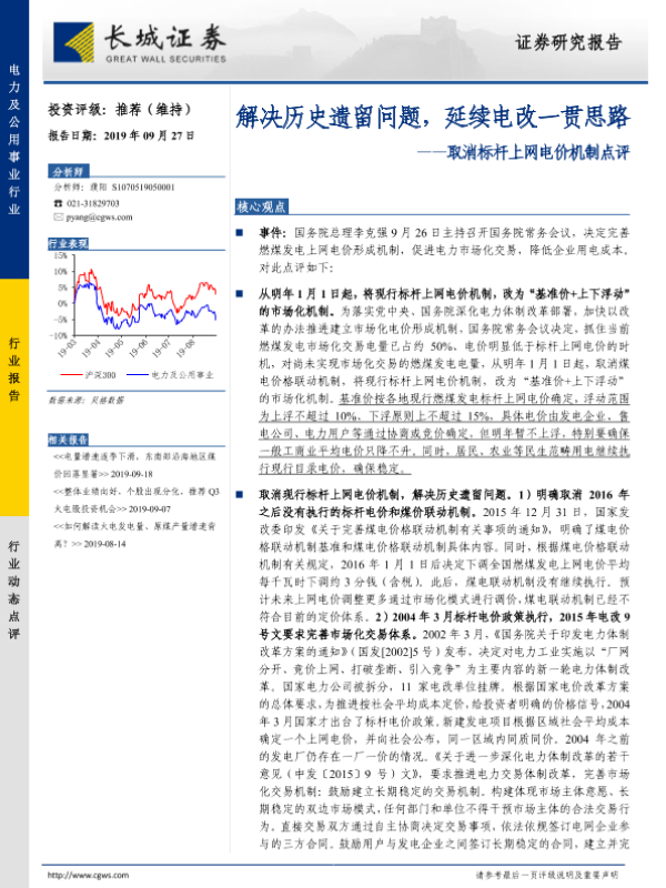 【长城证券】【20190927】电力及公用事业取消标杆上网电价机制点评:解决历史遗留问题,延续电改一贯思路-5页
