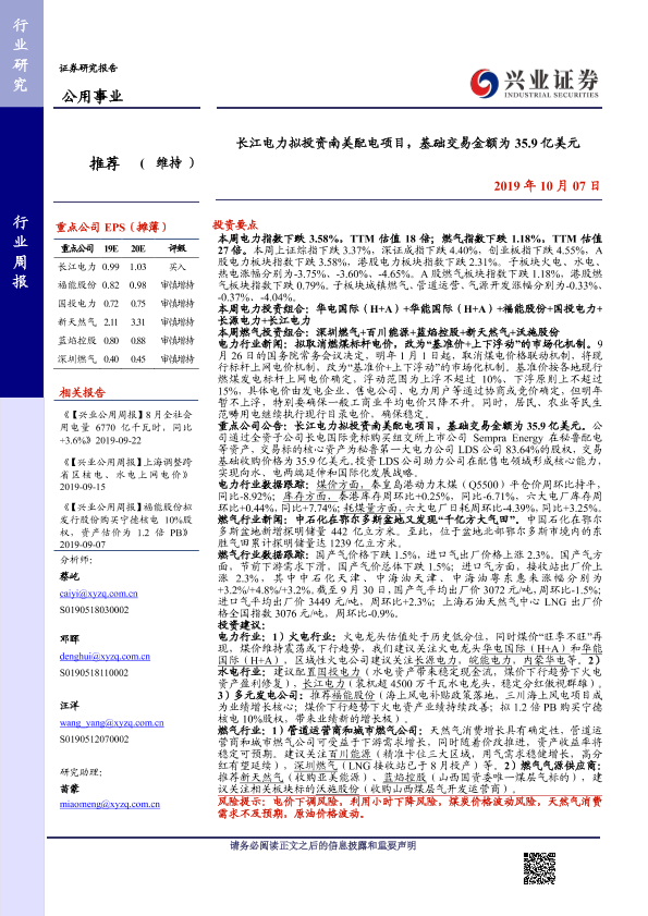【兴业证券】【20191007】长江电力拟投资南美配电项目,基础交易金额为35.9亿美元-17页