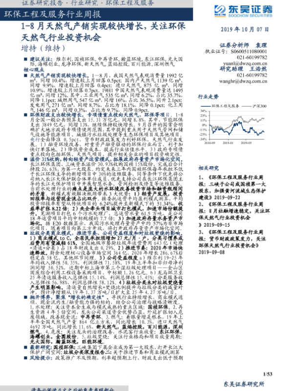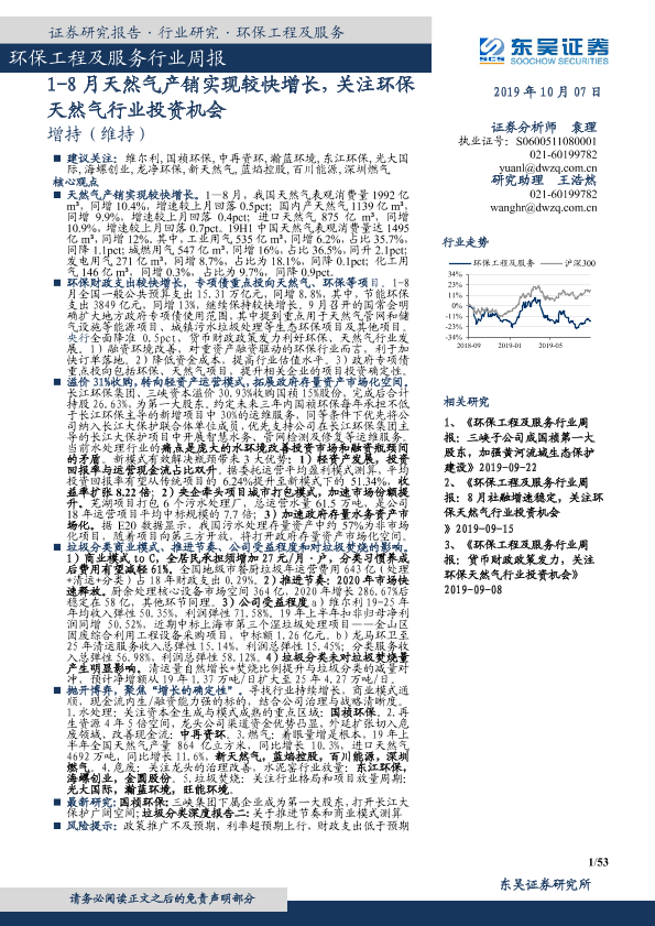【东吴证券】【20191007】环保工程及服务行业周报:1-8月天然气产销实现较快增长,关注环保天然气行业投资机会-53页