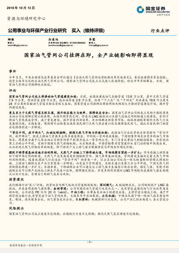 【国金证券】【20191013】国家油气管网公司挂牌在即,全产业链影响即将显现-3页