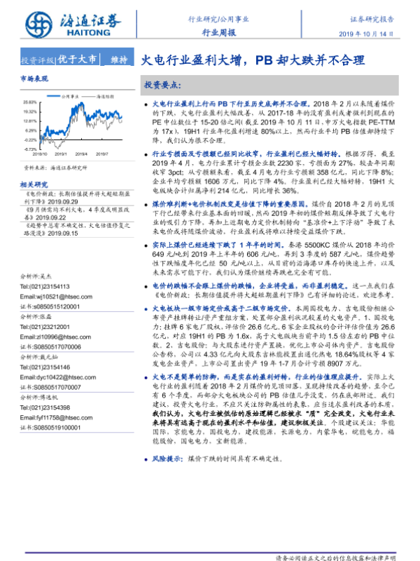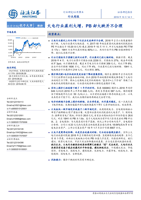【海通证券】【20191014】公用事业行业周报:火电行业盈利大增,PB却大跌并不合理-2页