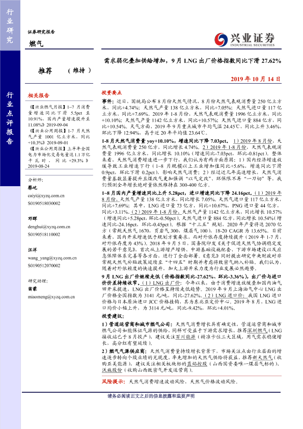 【兴业证券】【20191014】需求弱化叠加供给增加,9月LNG出厂价格指数同比下滑27.62%-10页
