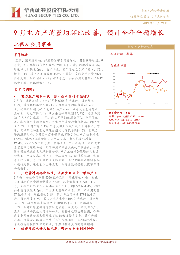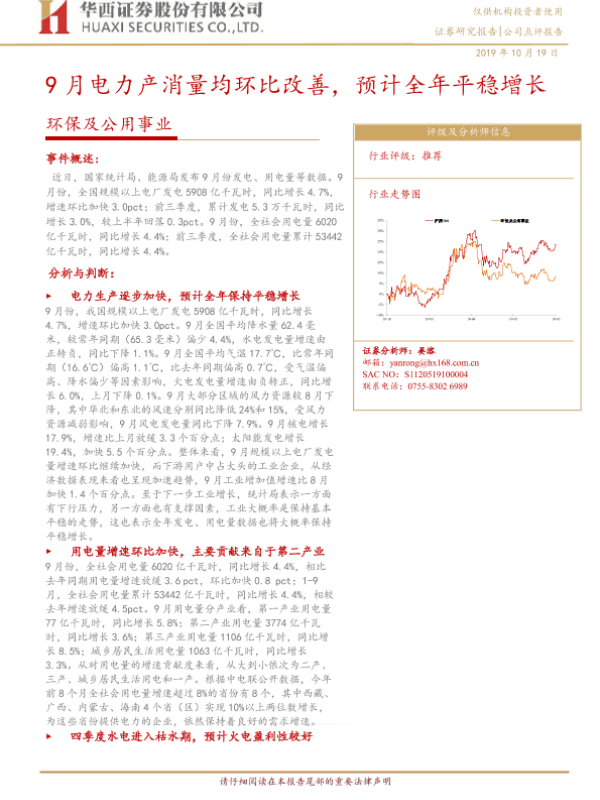 【华西证券】【20191019】9月电力产消量均环比改善,预计全年平稳增长-6页