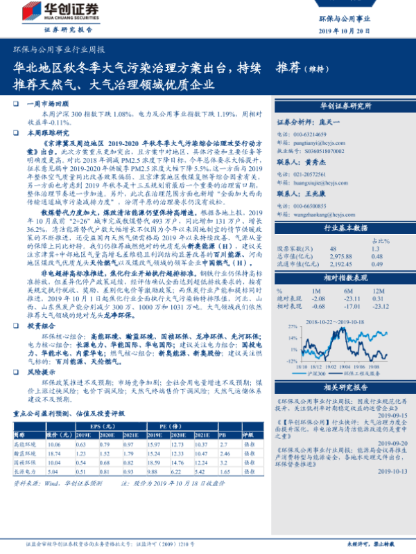 【华创证券】【20191020】环保及公用事业行业周报:华北地区秋冬季大气污染治理方案出台,持续推荐天然气、大气治理领域优质企业-28页