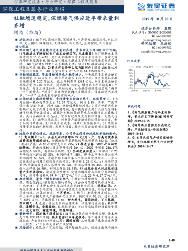 【东吴证券】【20191020】环保工程及服务行业周报:社融增速稳定,深燃海气供应近半带来量利齐增-48页