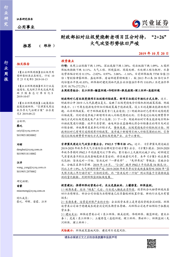【兴业证券】【20191020】财政部拟对垃圾焚烧新老项目区分对待,“2+26”大气攻坚形势依旧严峻-10页