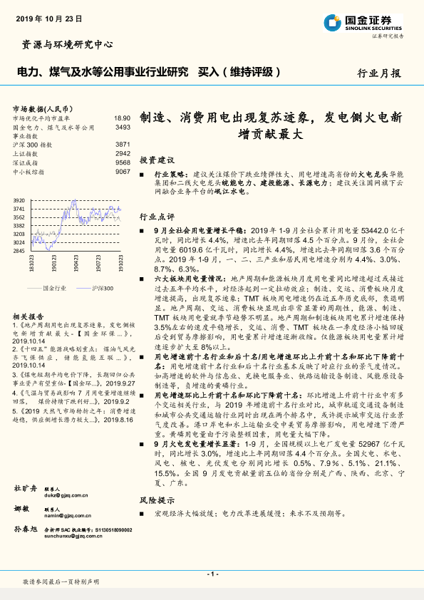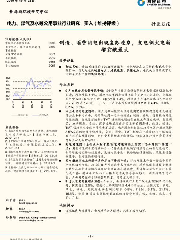 【国金证券】【20191023】电力、煤气及水等公用事业行业研月报:制造、消费用电出现复苏迹象,发电侧火电新增贡献最大-13页