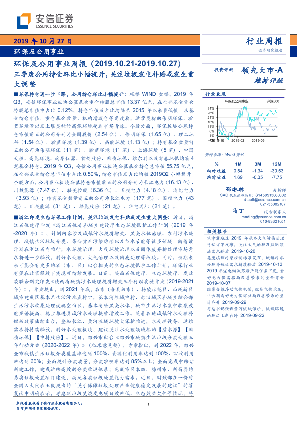 【安信证券】【20191027】环保及公用事业周报:三季度公用持仓环比小幅提升,关注垃圾发电补贴或发生重大调整-25页
