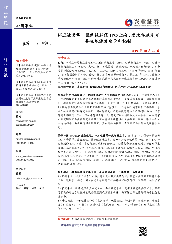 【兴业证券】【20191027】公用事业行业周报:环卫运营第一股侨银环保IPO过会,发改委稳定可再生能源发电价补机制-10页