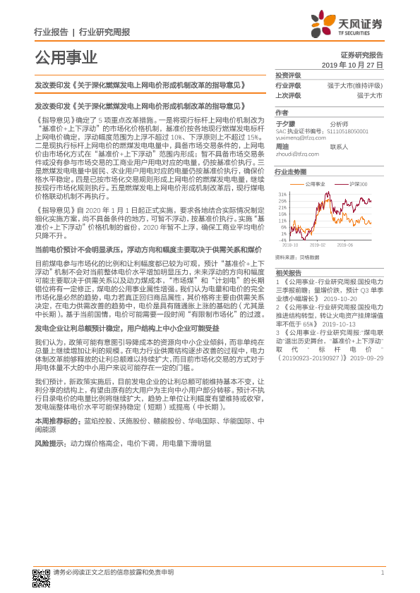 【天风证券】【20191027】公用事业行业研究周报:发改委印发《关于深化燃煤发电上网电价形成机制改革的指导意见》-9页