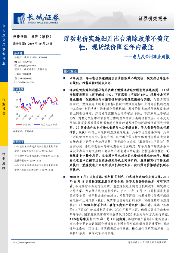 【长城证券】【20191027】浮动电价实施细则出台消除政策不确定性,现货煤价降至年内最低-14页