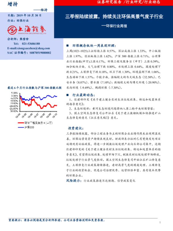 【上海证券】【20191030】环保行业周报:三季报陆续披露,持续关注环保高景气度子行业-8页