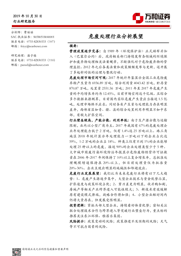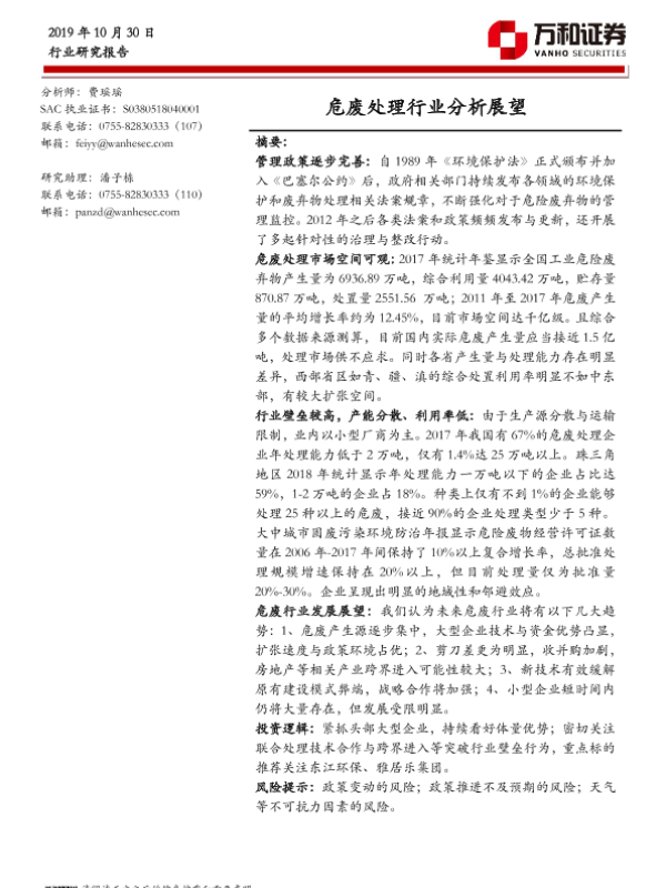 【万和证券】【20191030】危废处理行业分析展望-16页