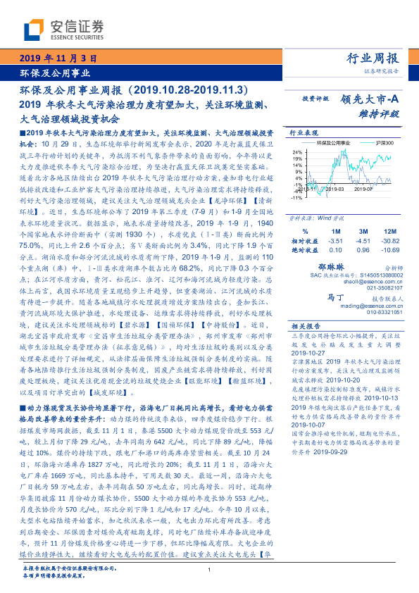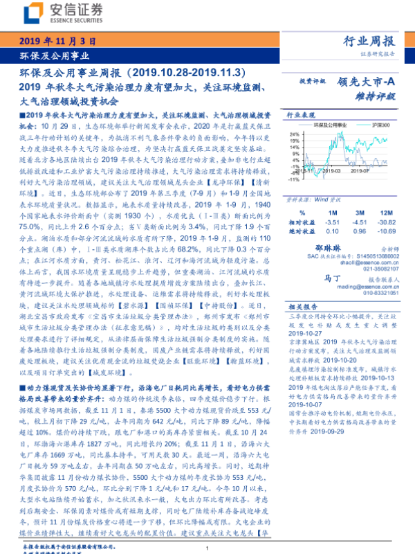 【安信证券】【20191103】环保及公用事业周报:2019年秋冬大气污染治理力度有望加大-25页