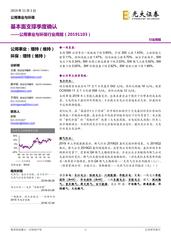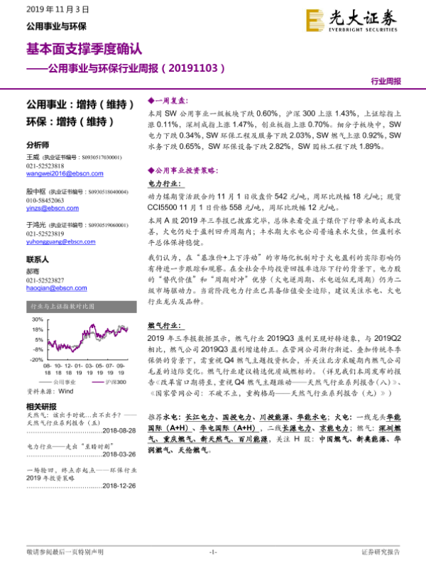 【光大证券】【20191103】公用事业与环保行业周报:基本面支撑季度确认-20页