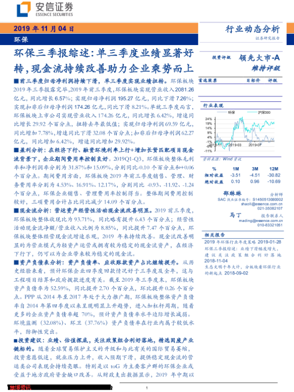 业绩分析 投资建议 环保行业 现金流 资产负债