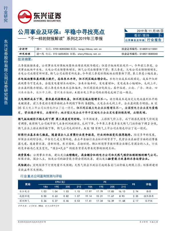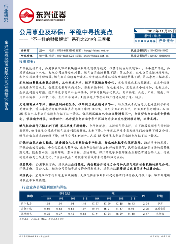 【东兴证券】【20191105】2019年三季报:公用事业及环保行业报告:平稳中寻找亮点-19页