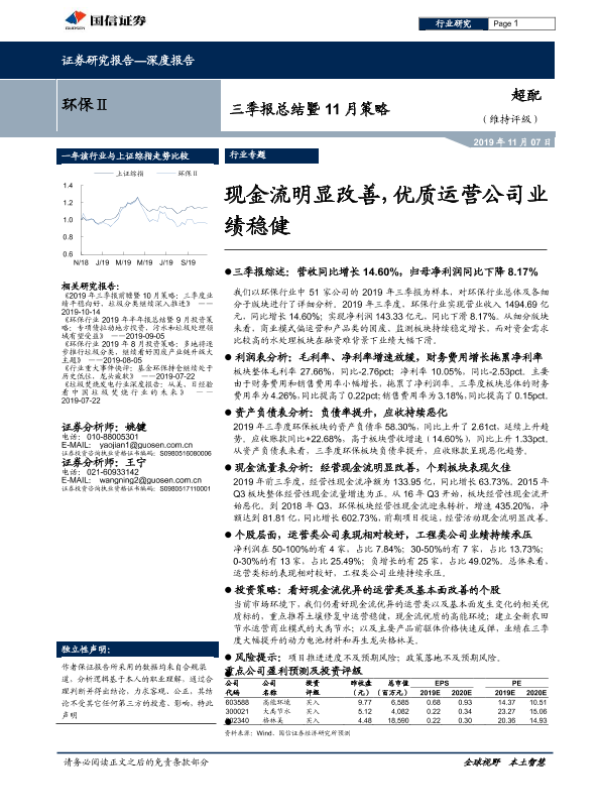 【国信证券】【20191107】环保Ⅱ三季报总结暨11月策略:现金流明显改善,优质运营公司业绩稳健-13页