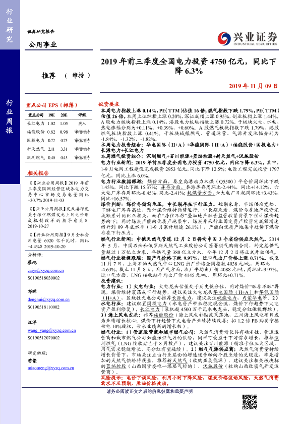 【兴业证券】【20191109】2019年前三季度全国电力投资4750亿元,同比下降6.3%-17页